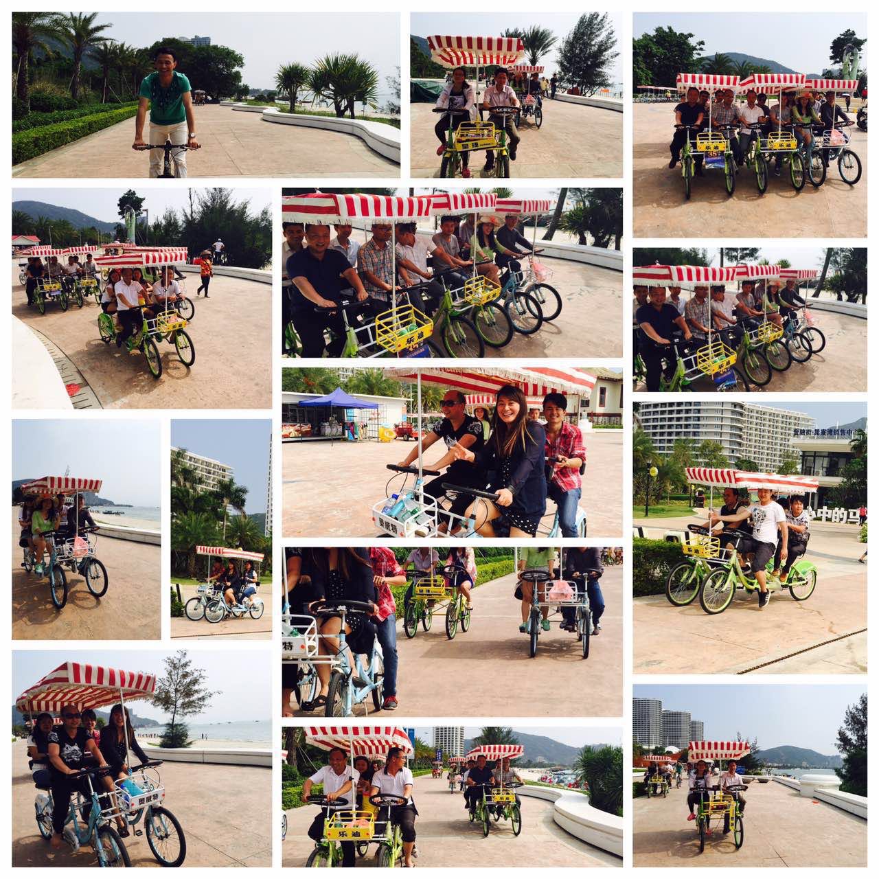 第二天一早大家便來到了素有中國式馬爾代夫之稱巽寮灣海灘邊,欣賞白沙灘,綠藍(lán)分明的海水,體驗(yàn)了慢船在海中捕魚及快艇海中速度般飛越的感覺,大家都意猶未盡不舍上岸……拓展公司見我們都不愿意離開,簡(jiǎn)單的午餐過后,組織了大家集體騎自行車環(huán)海觀光,一邊悠閑地踩著自行車,一邊吃著冰激淋,一邊吹著海風(fēng)和同事們嘻鬧,讓我們大家都開懷大笑!