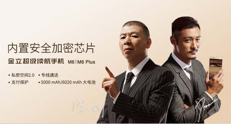 這款在7月26日發布的內置安全加密芯片手機由馮小剛和余文樂進行品牌代言。由馮小剛余文樂聯合打造的《手機芯戰》預告片中,隱約出現的機器就是金立M6和M6 Plus,整個預告片貫穿著信息時代“安全”的重要性。