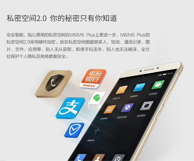 M6/M6 PLUS的私密空間2.0采用硬件加密算法,放在私密空間里的信息就算手機丟失別人也無法破譯,全方位保護個人隱私及商務數據安全。